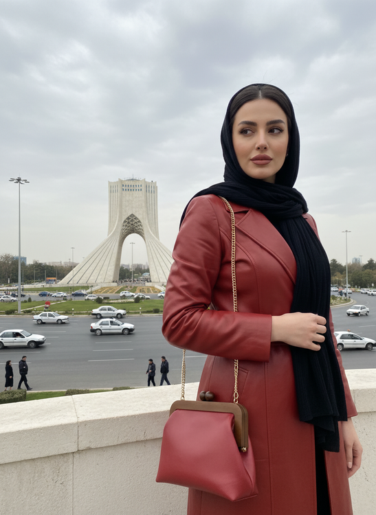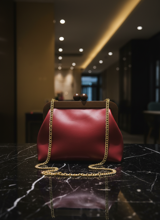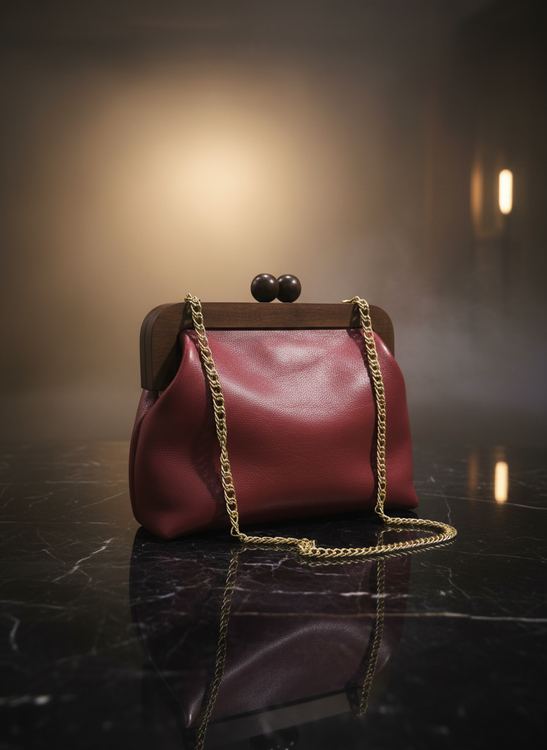 کیف دهانه چوبی با چرم گاوی رنگ قرمز جذاب با آستر اشبالت و بند دوشی زنجیری رنگ ثابت