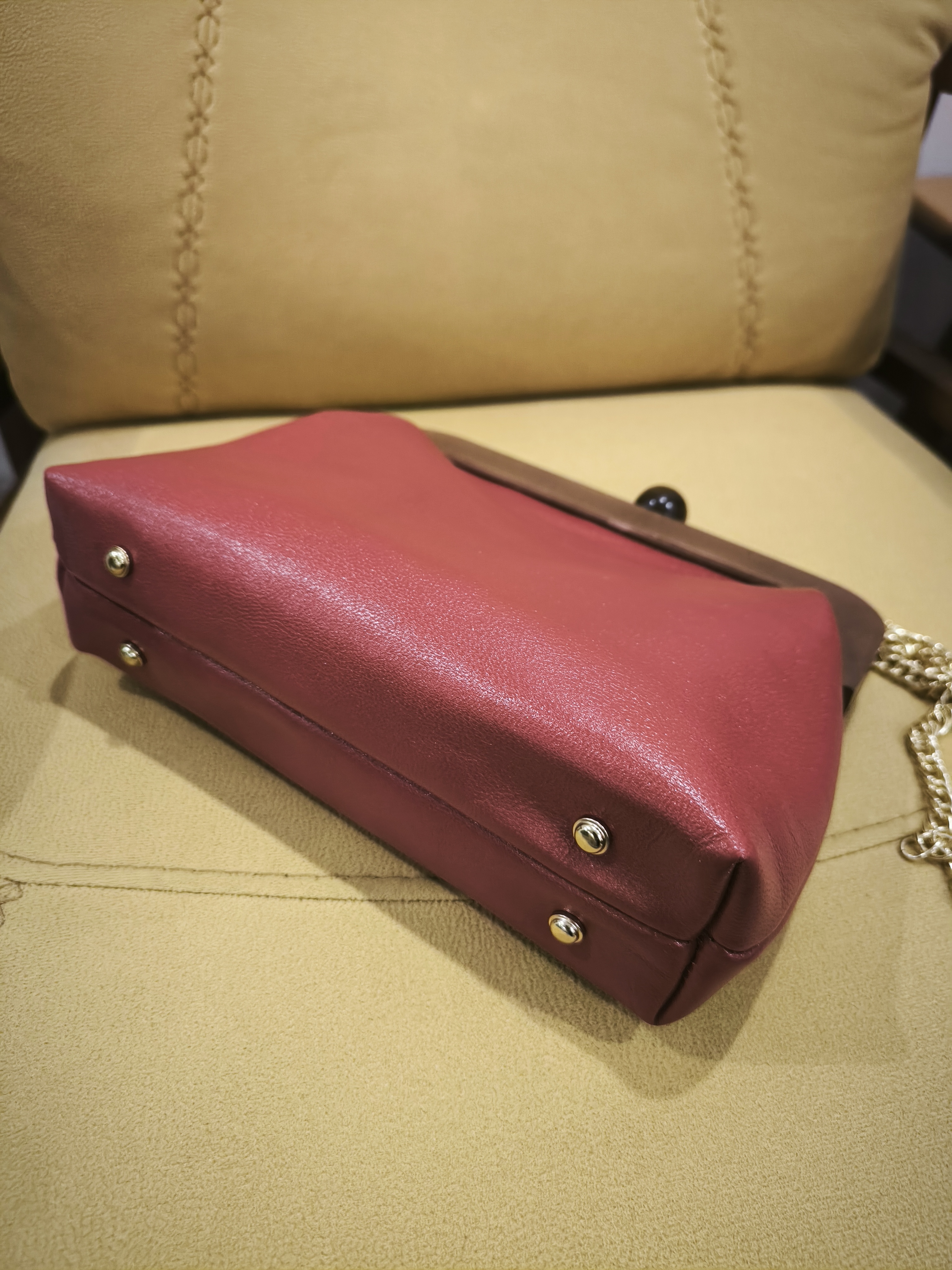 کیف دهانه چوبی با چرم گاوی رنگ قرمز جذاب با آستر اشبالت و بند دوشی زنجیری رنگ ثابت