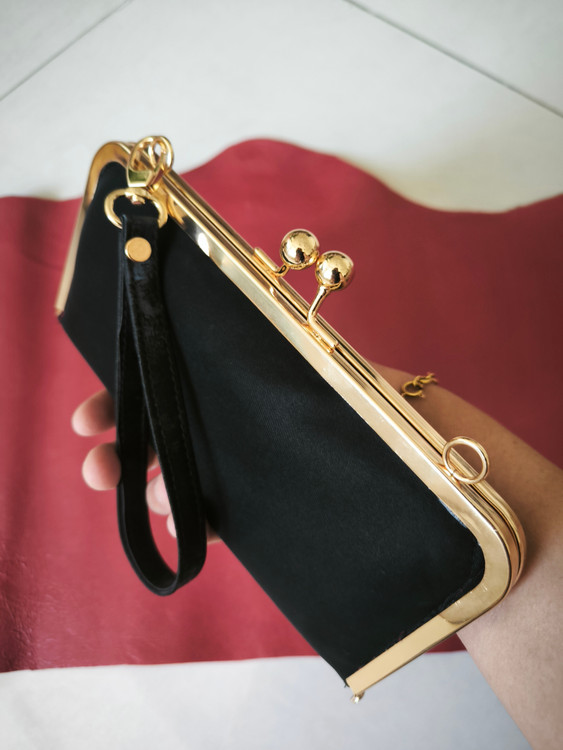 کیف پول زنانه دهانه ی فلزی رنگ ثابت جنس چرم نانسی مشکی آستر اشبالت زرشکی که دو طرف جای کارت وسط زیپ و جیب جدا دارد
