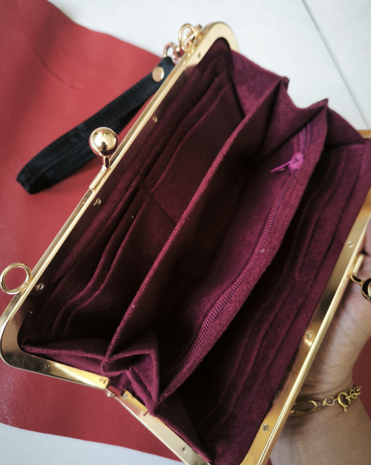 کیف پول زنانه دهانه ی فلزی رنگ ثابت جنس چرم نانسی مشکی آستر اشبالت زرشکی که دو طرف جای کارت وسط زیپ و جیب جدا دارد
