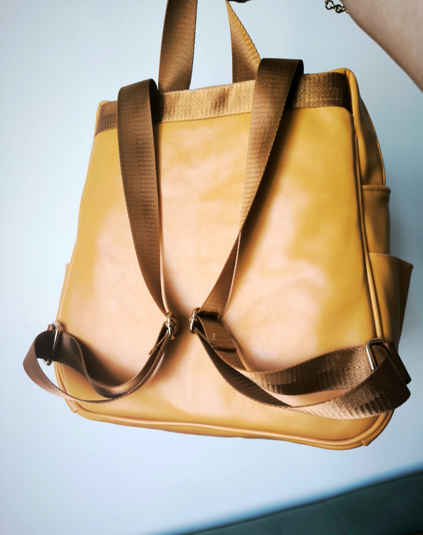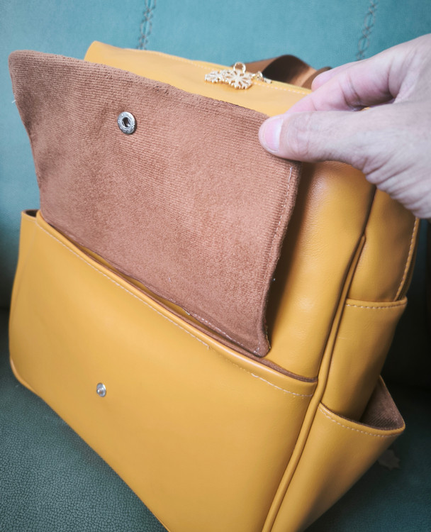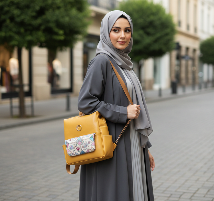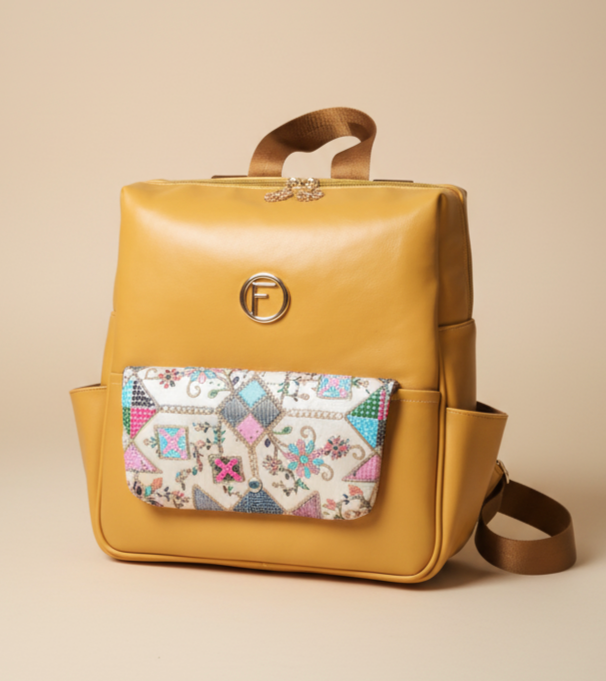 کوله پشتی دخترانه چرم ساده خردلی با ترکیب پارچه مجلسی