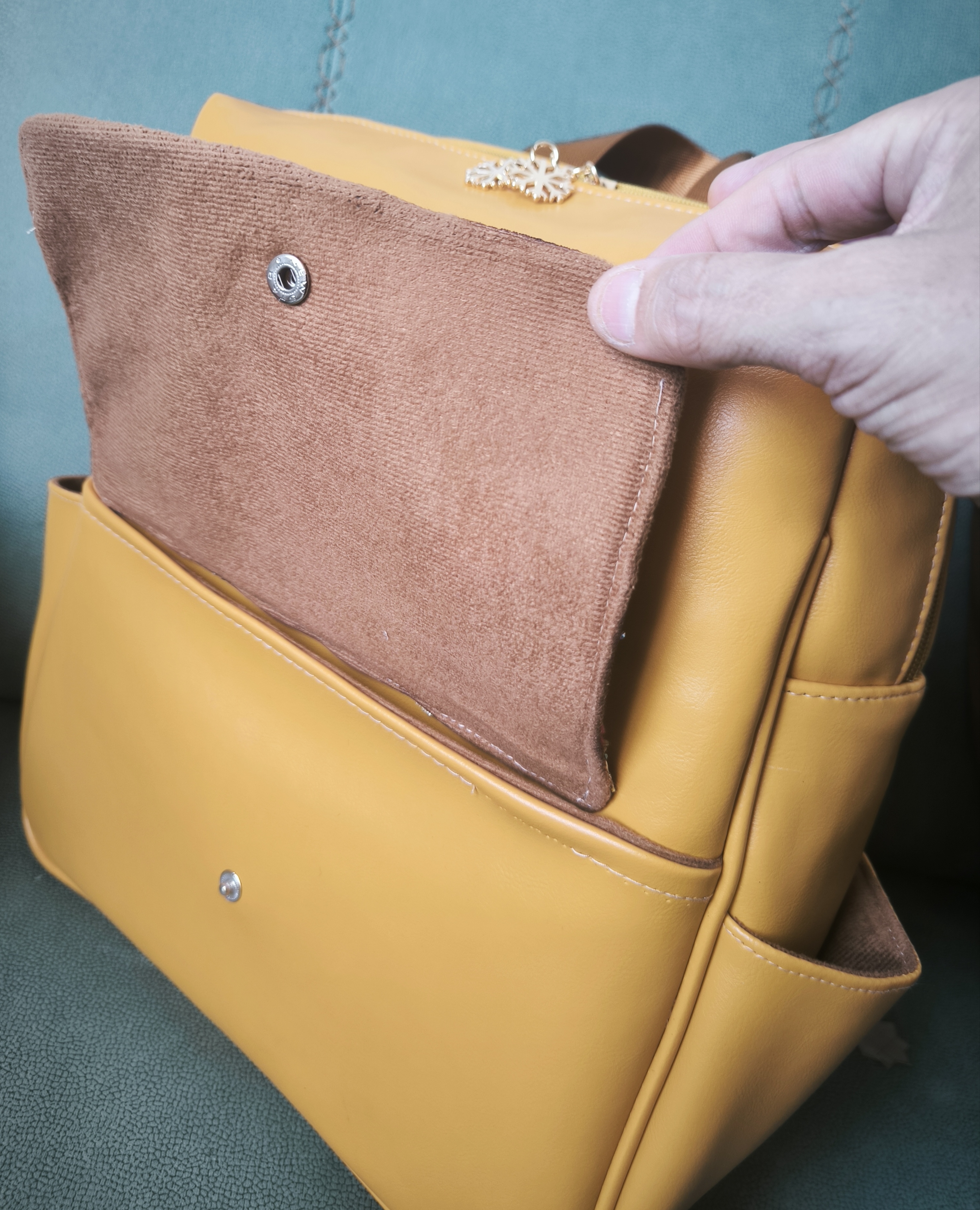 کوله پشتی دخترانه چرم ساده خردلی با ترکیب پارچه مجلسی