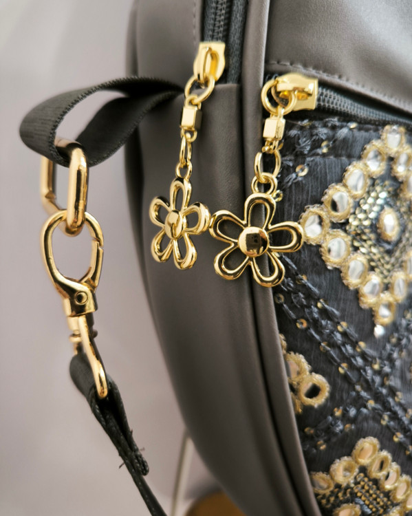 جنس چرم صنعتی طوسی با ترکیب پارچه مجلسی کاملا ضدآب با فوم 8 میل و دو عدد جیب جای کتاب و وسایل شخصی آستر کشی کامل دسته و بند رو دوشی نوار کامواس و یراق رنگ ثابت بسیارزیبا