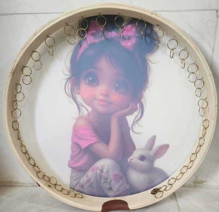 دف کودک دخترانه مناسب برای کودکان 3 تا 10 سال قطر دف 40سانت میباشد چاپ ضدآب داخل حلقه ی دف جا انگشتی برای نواختن