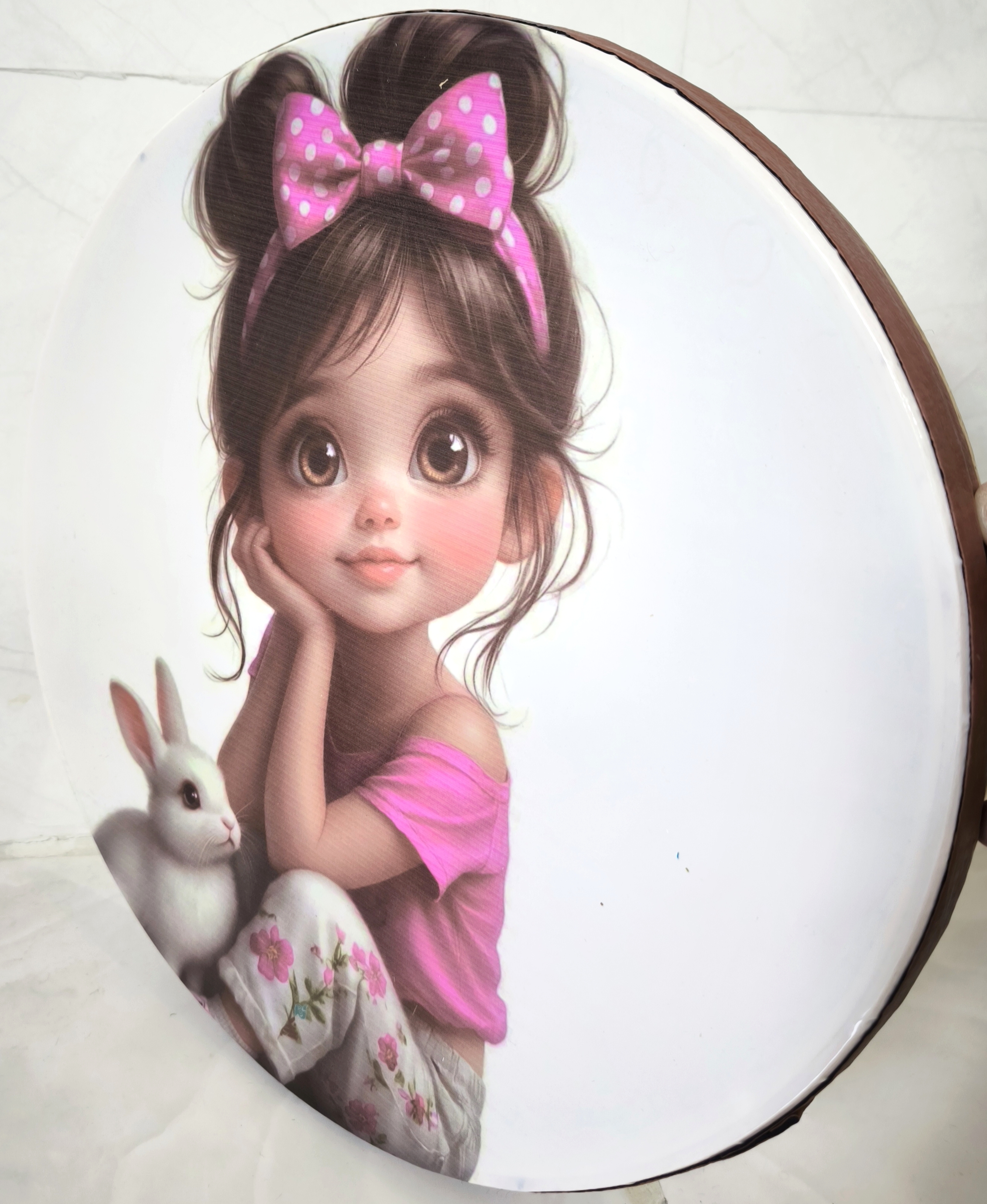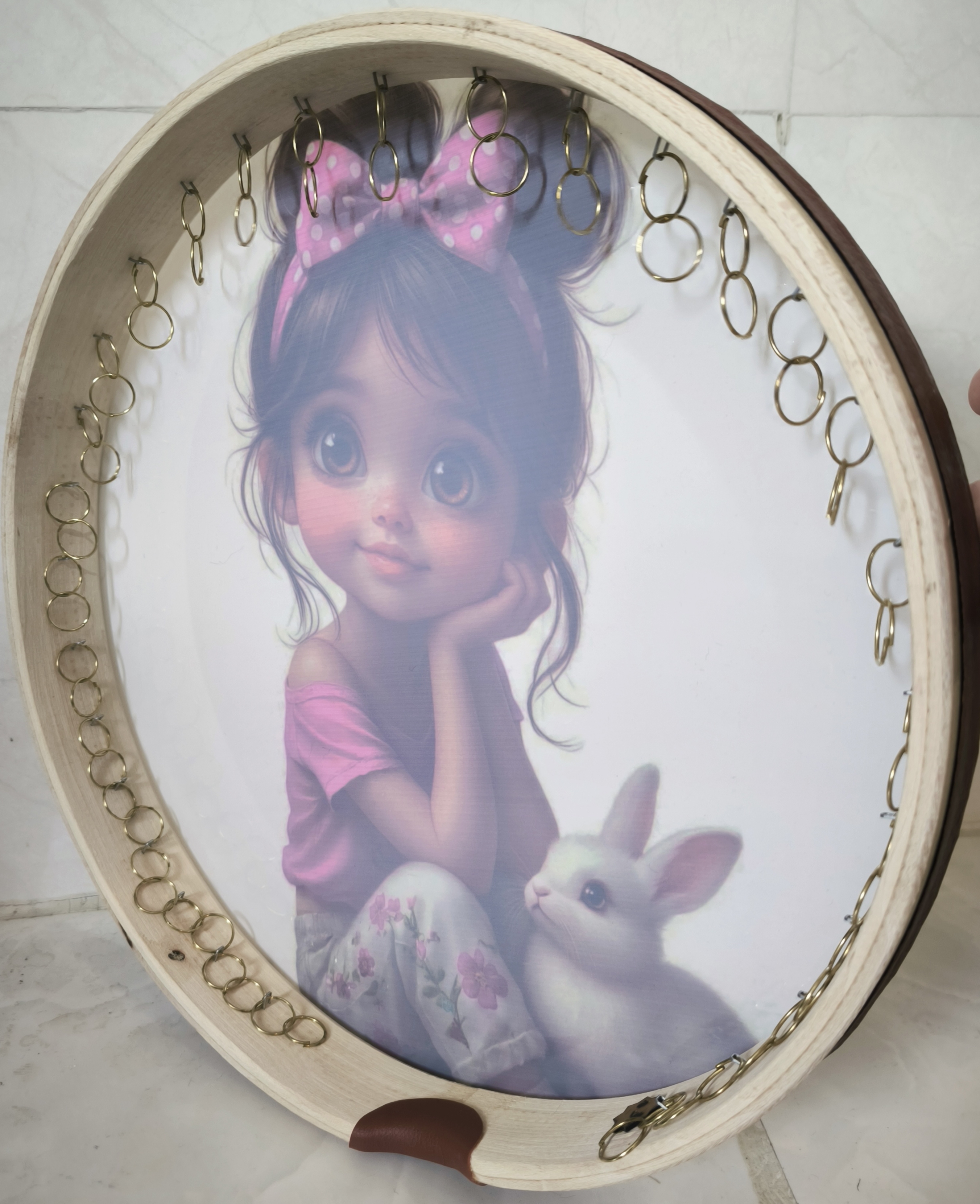 دف کودک دخترانه مناسب برای کودکان 3 تا 10 سال قطر دف 40سانت میباشد چاپ ضدآب داخل حلقه ی دف جا انگشتی برای نواختن